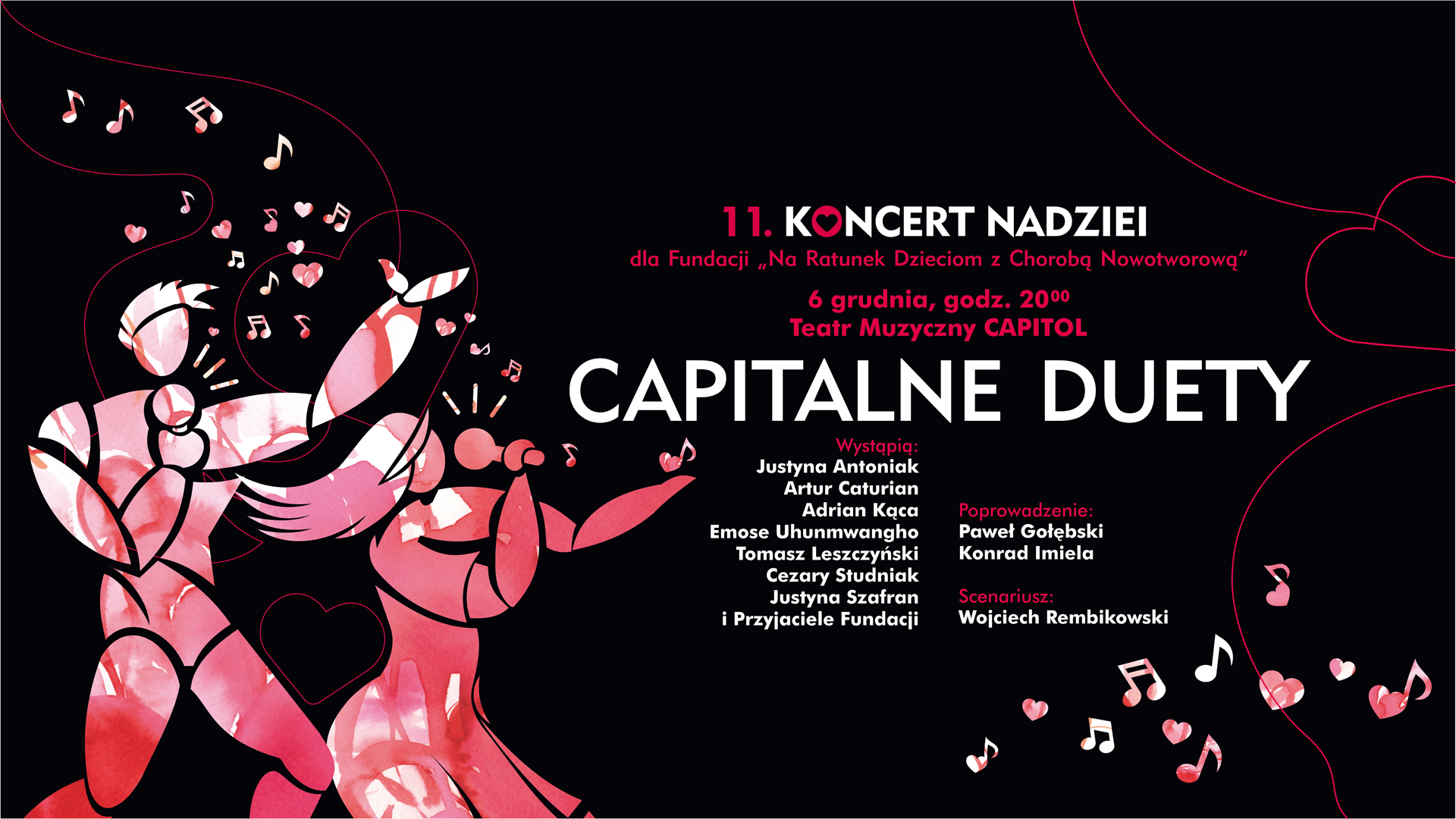 Podczas Koncertu Nadziei “Capitalne Duety”, na scenie pojawią się artystki i artyści Capitolu w duetach z przyjaciółmi Fundacji „Na Ratunek Dzieciom z Chorobą Nowotworową” i kliniki onkologicznej Przylądek Nadziei. Będzie to nie tylko wydarzenie artystyczne, przede wszystkim przyświeca mu idea pomocy dzieciom walczącym z chorobą nowotworową. Poprzedni taki koncert przyniósł pół miliona złotych w zbiórce na leczenie i opiekę nad najmłodszymi pacjentami.