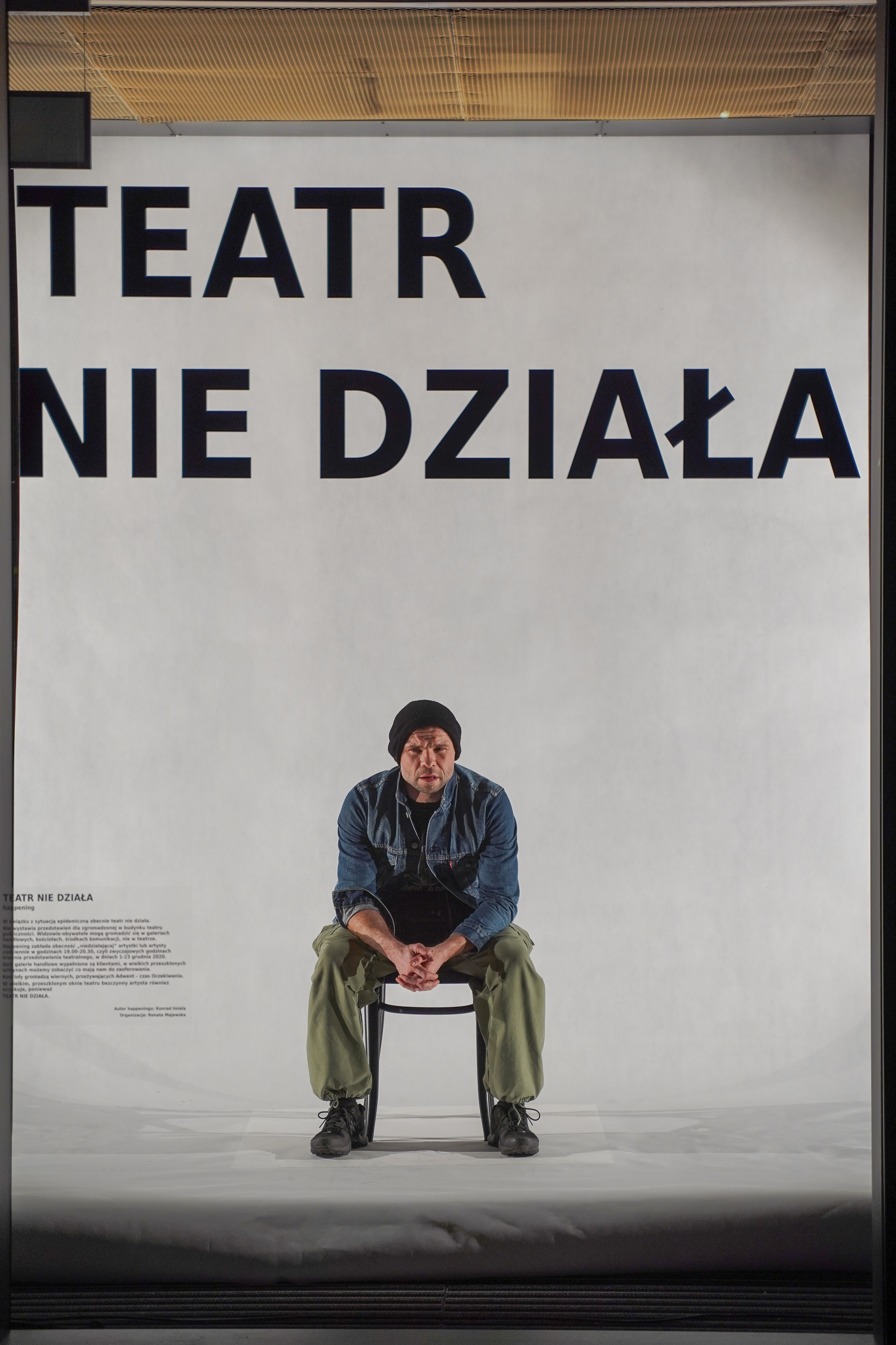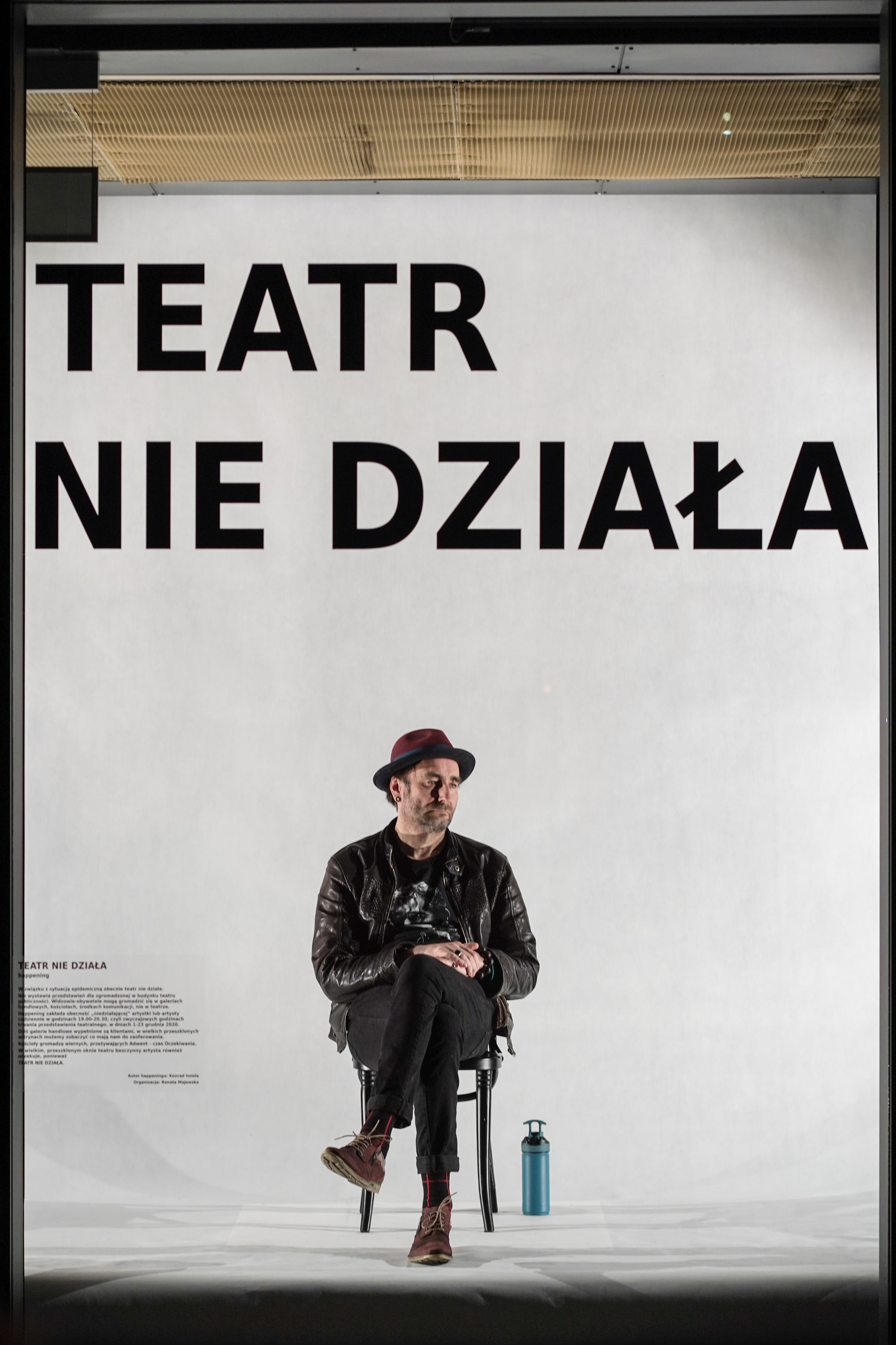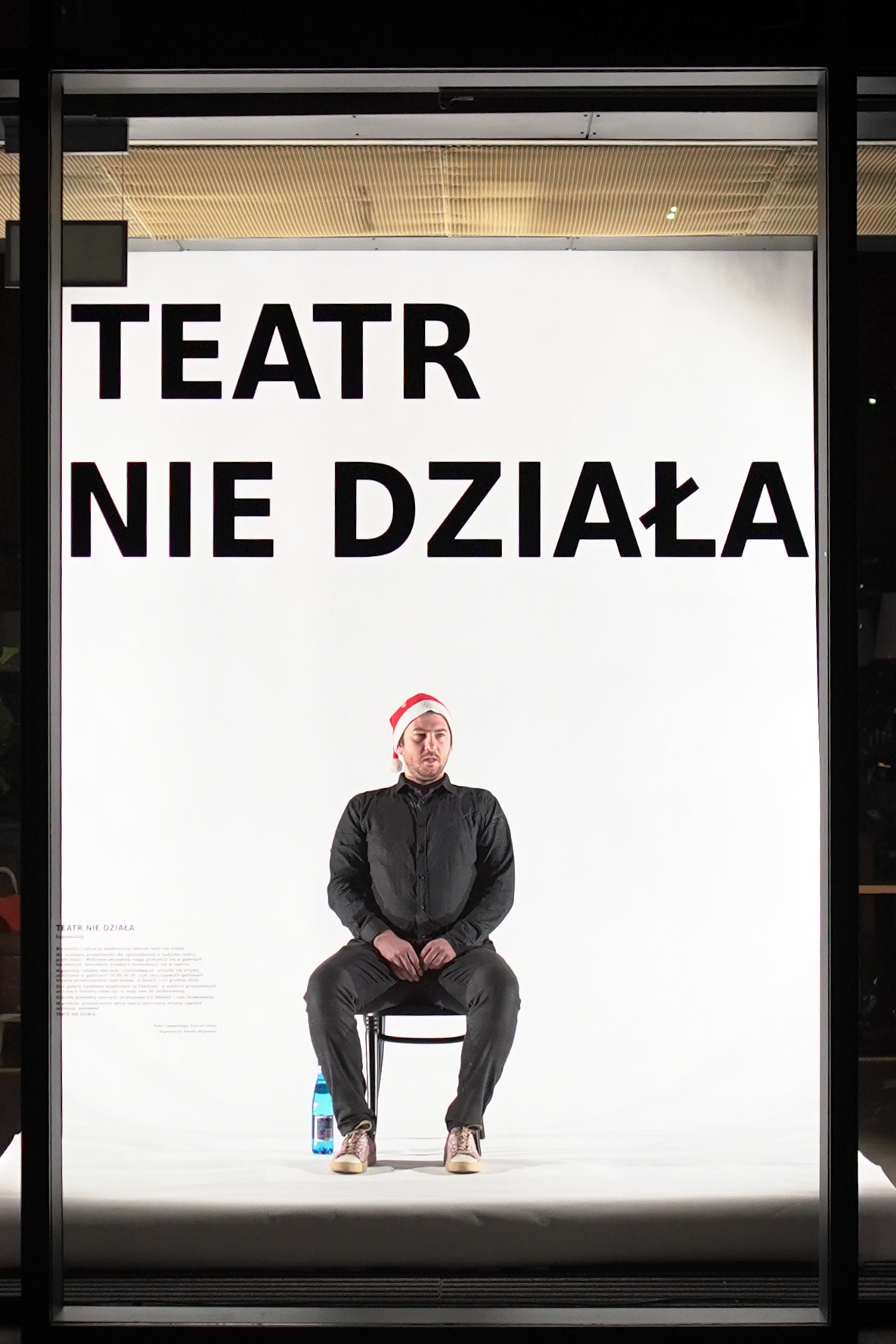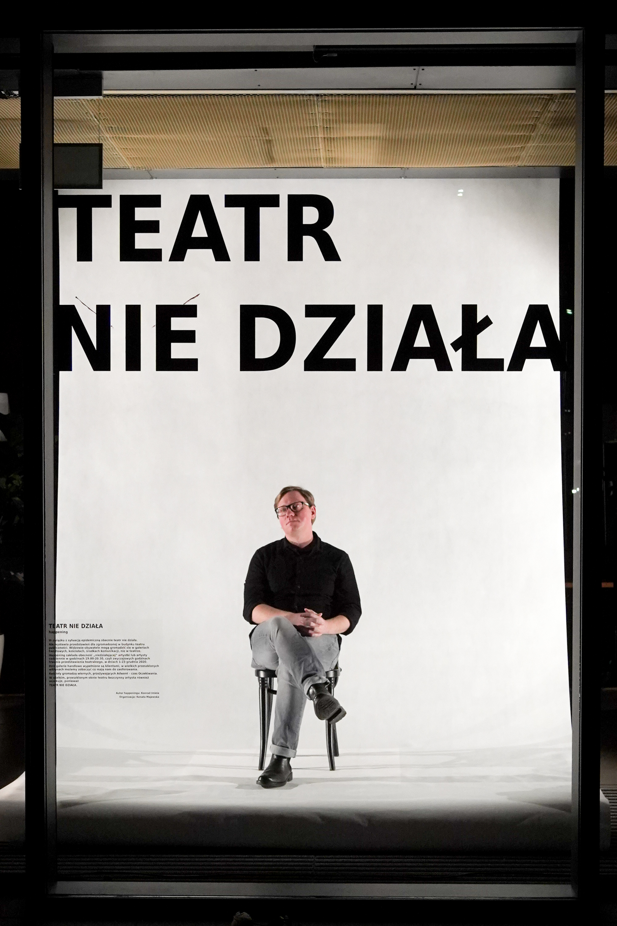 W wielkim, przeszklonym oknie teatru bezczynny artysta również oczekuje, ponieważ  TEATR NIE DZIAŁA.