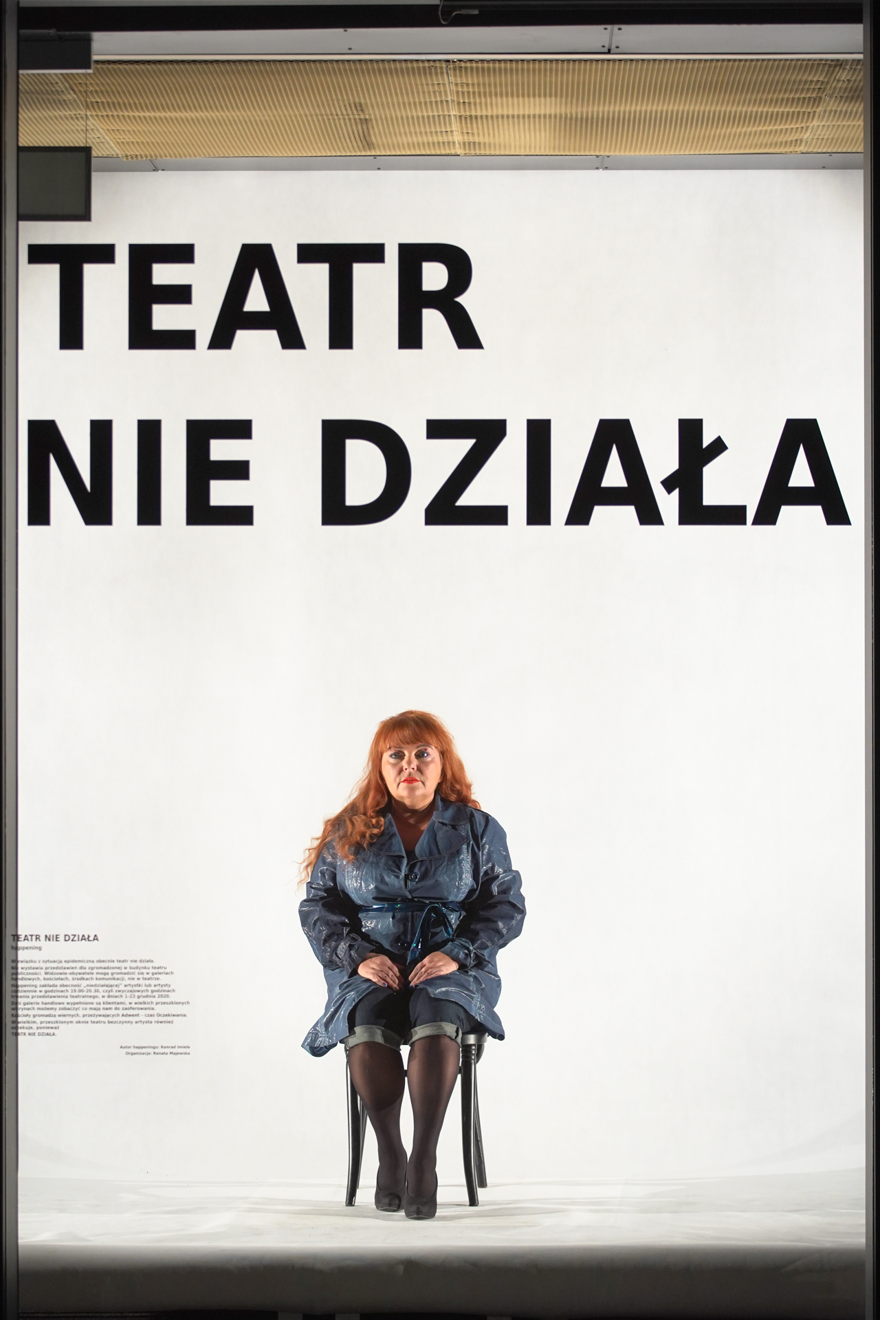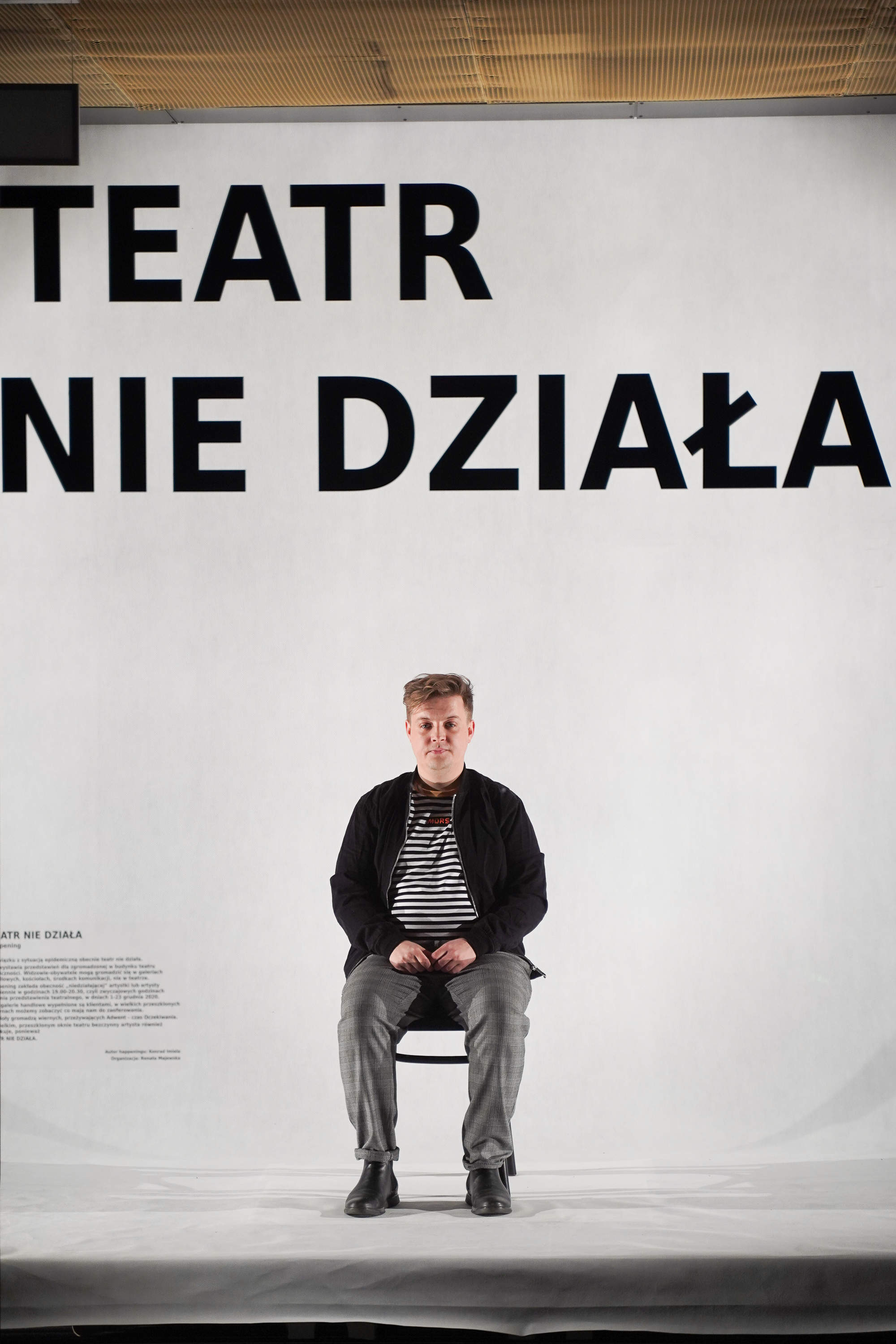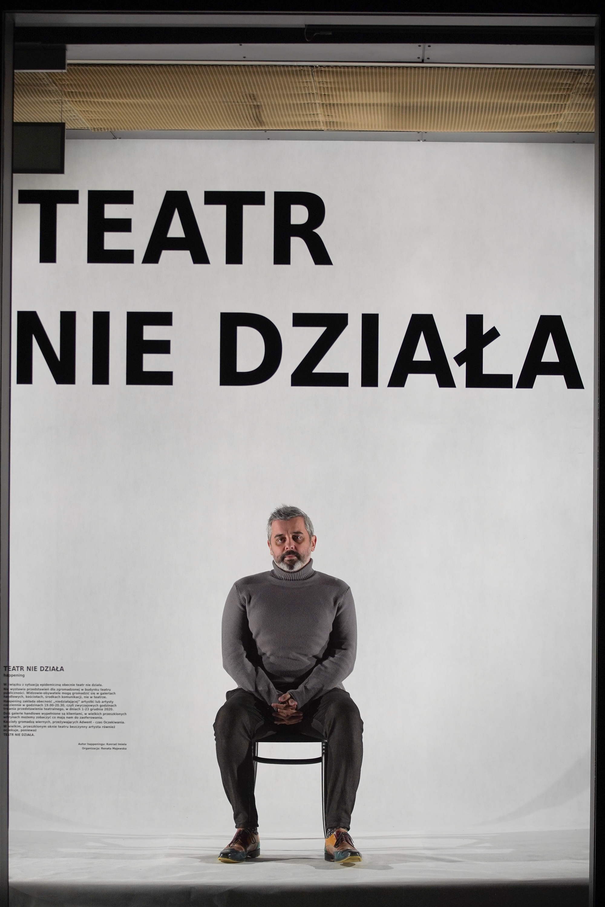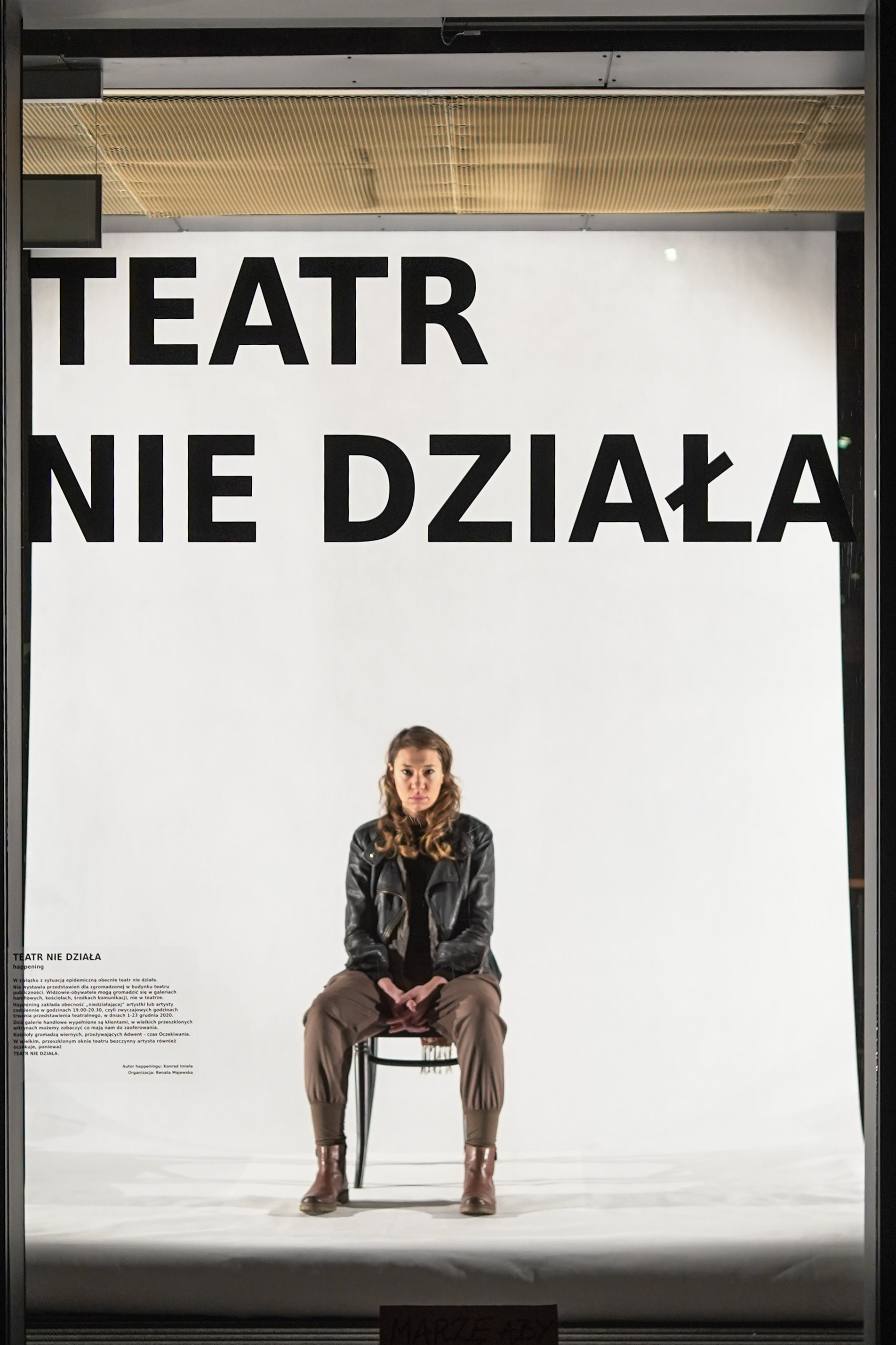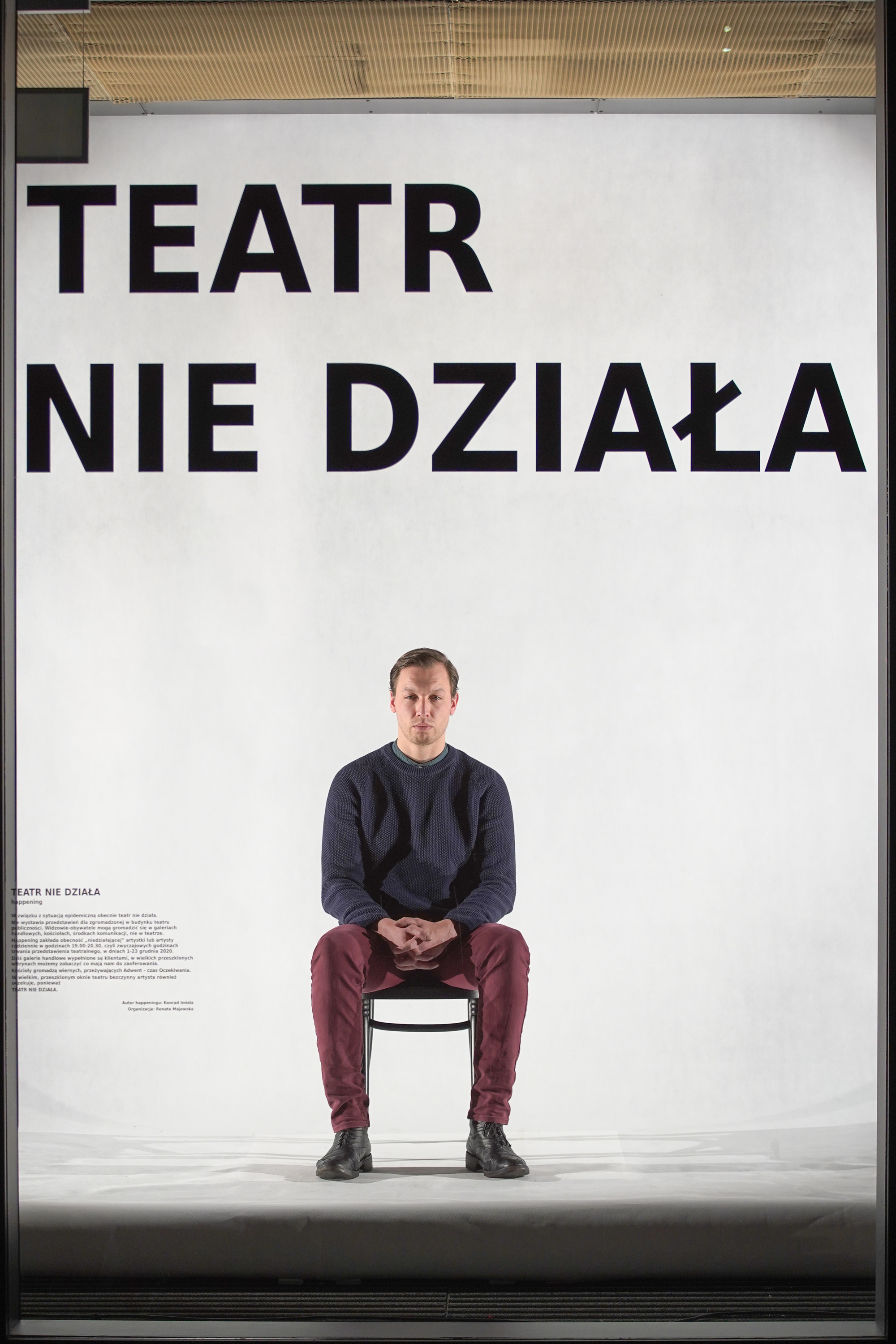 W wielkim, przeszklonym oknie teatru bezczynny artysta również oczekuje, ponieważ  TEATR NIE DZIAŁA.