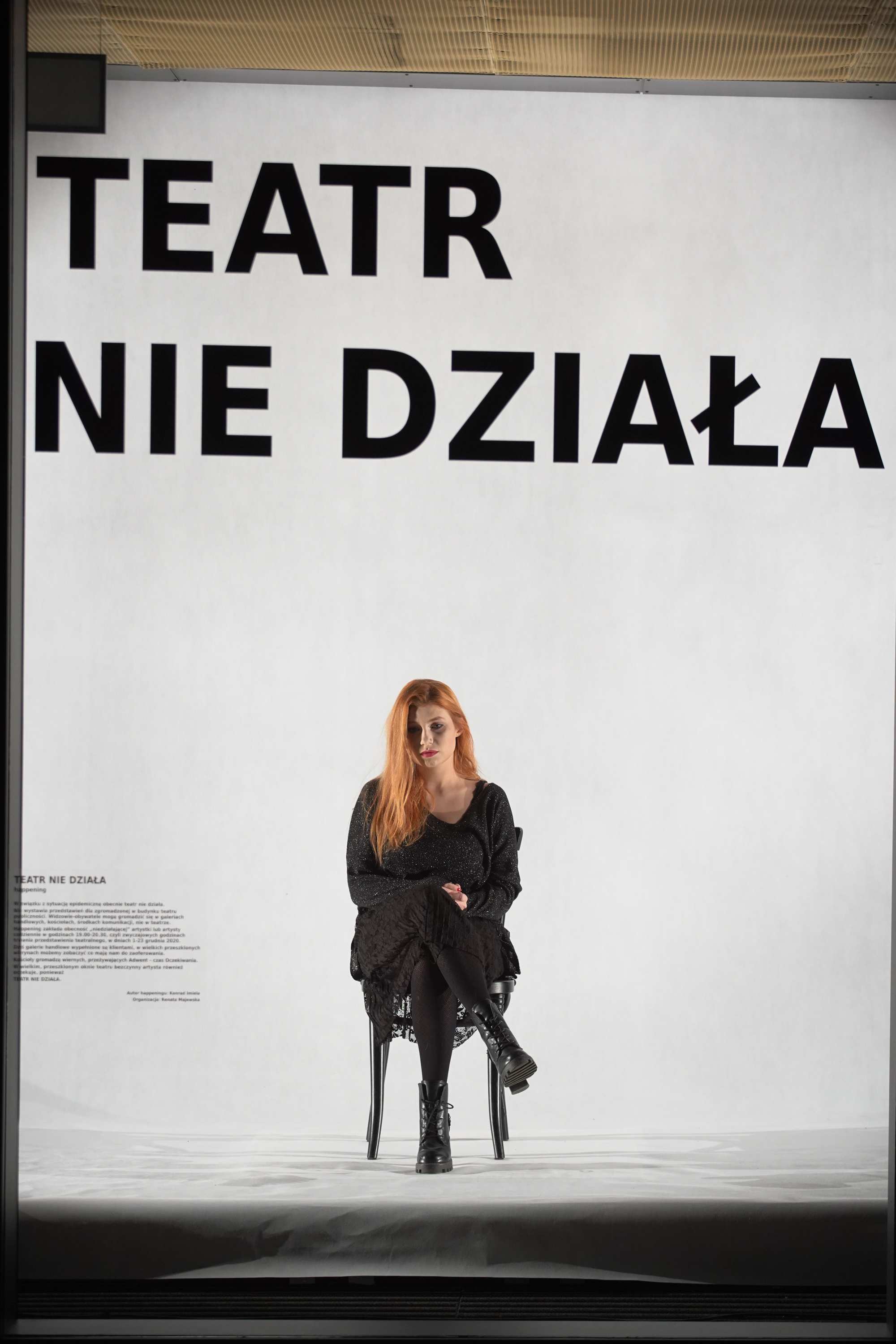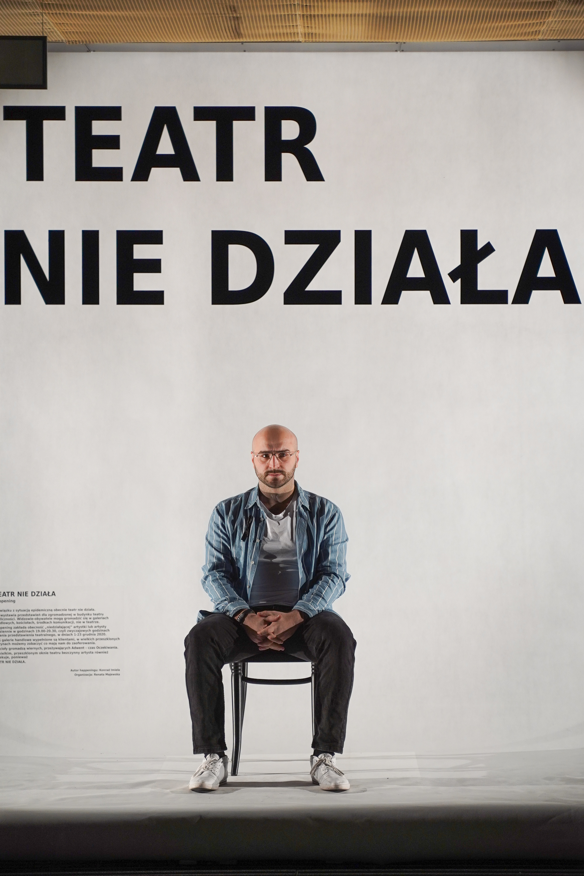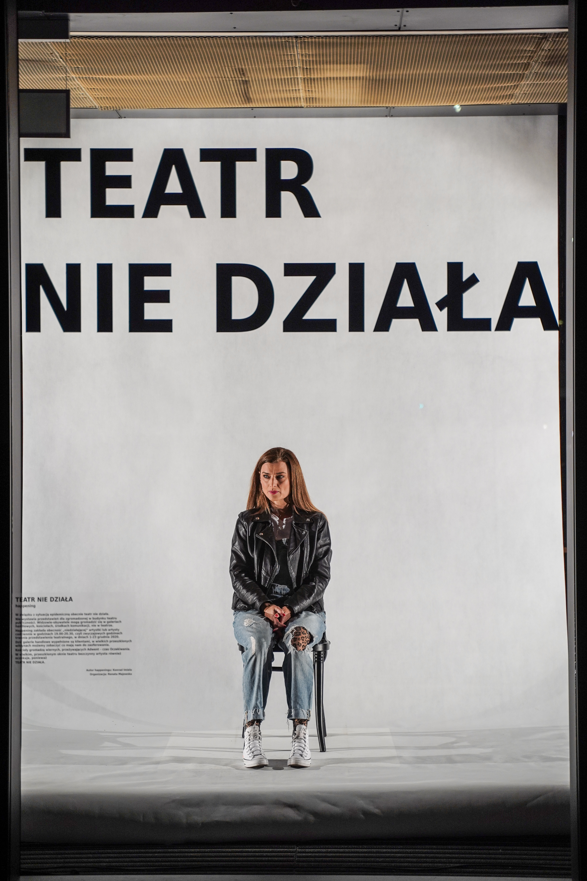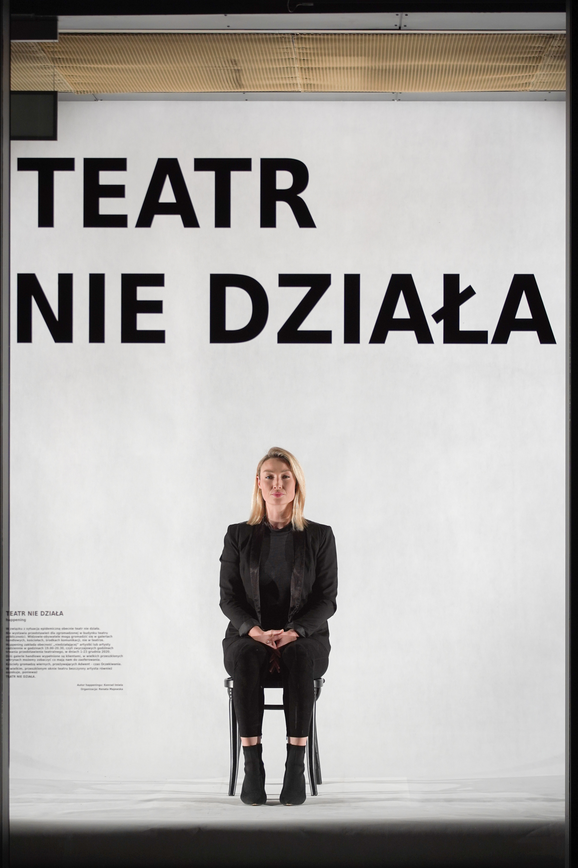 W wielkim, przeszklonym oknie teatru bezczynny artysta również oczekuje, ponieważ  TEATR NIE DZIAŁA.