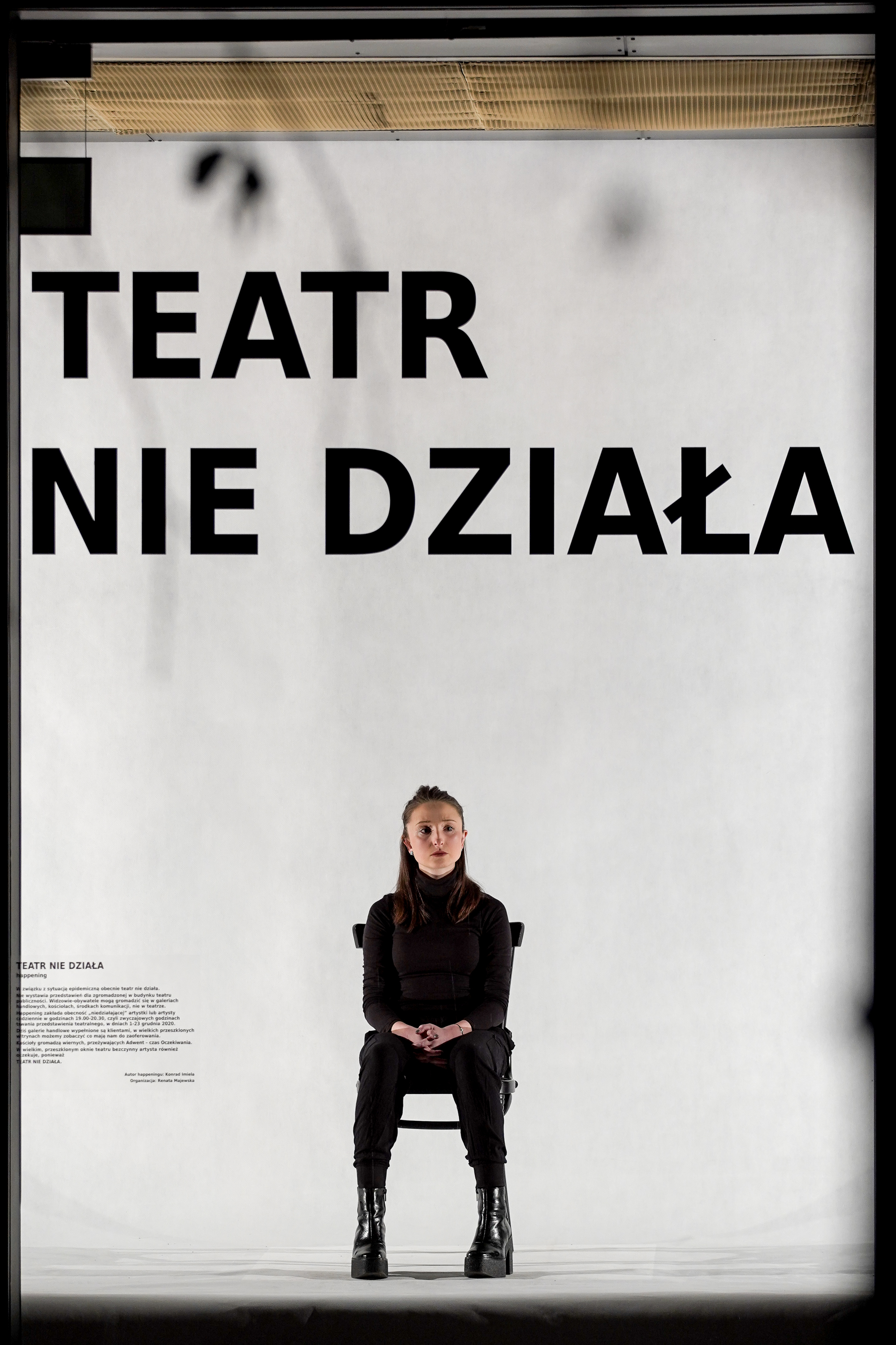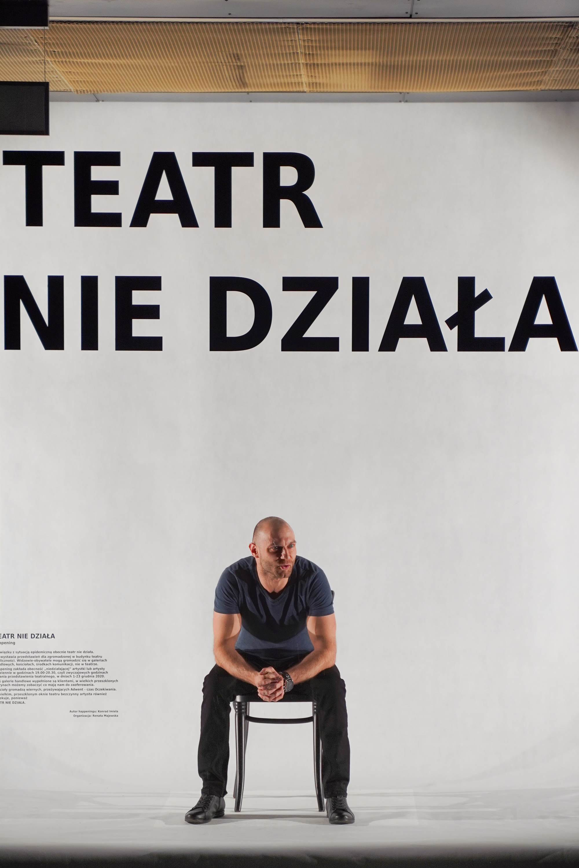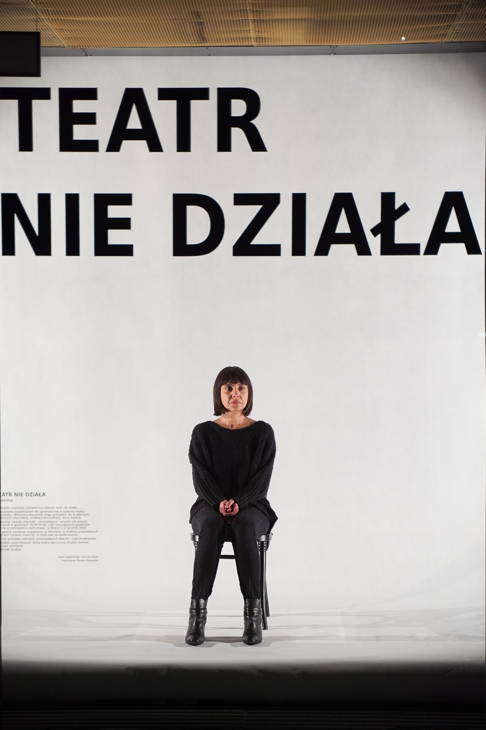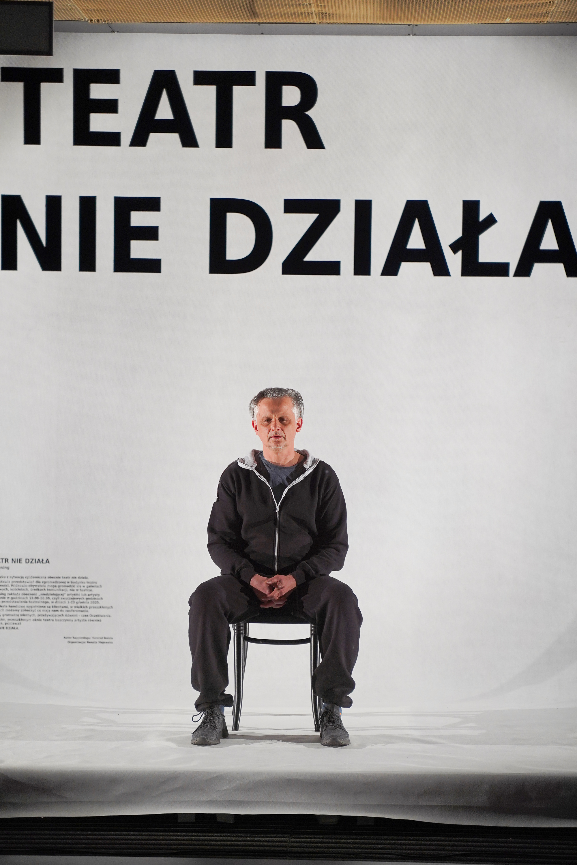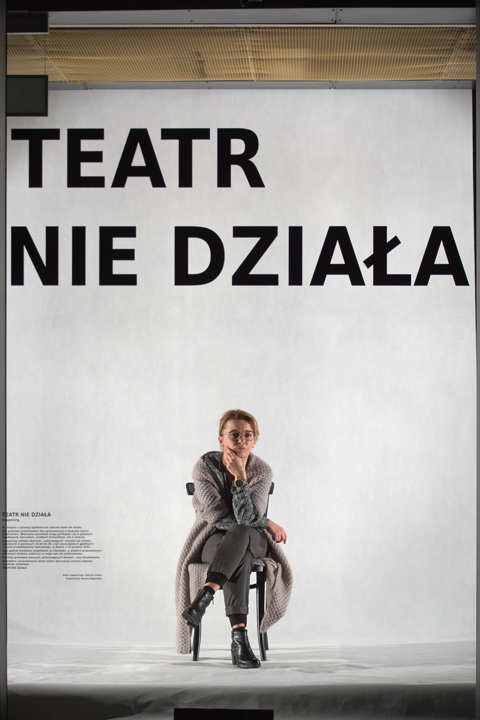 W wielkim, przeszklonym oknie teatru bezczynny artysta również oczekuje, ponieważ  TEATR NIE DZIAŁA.