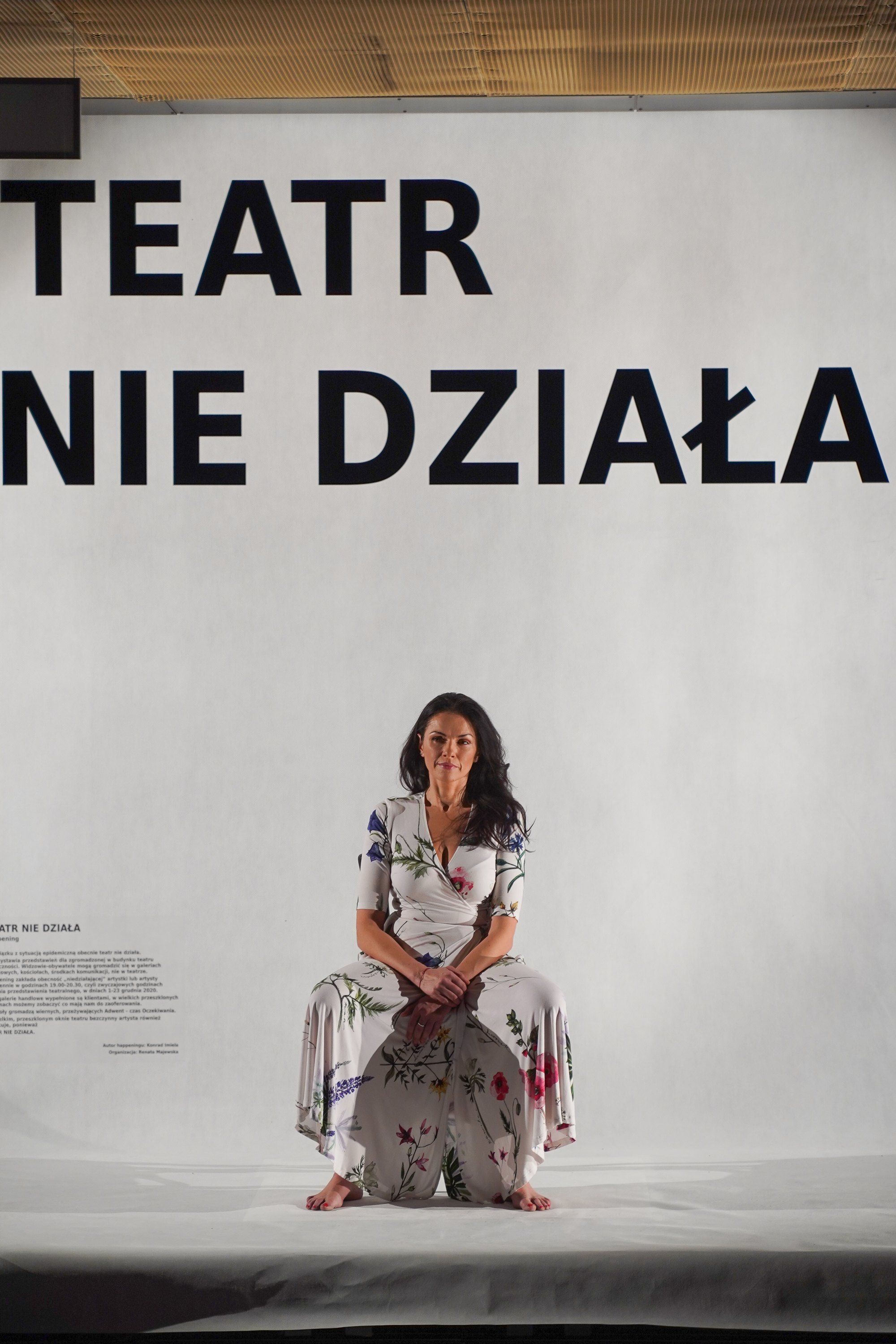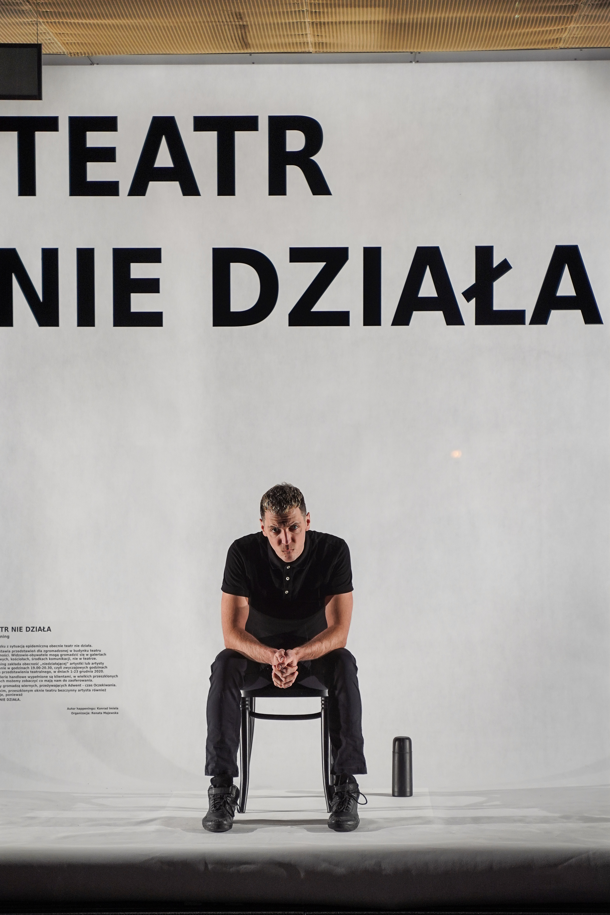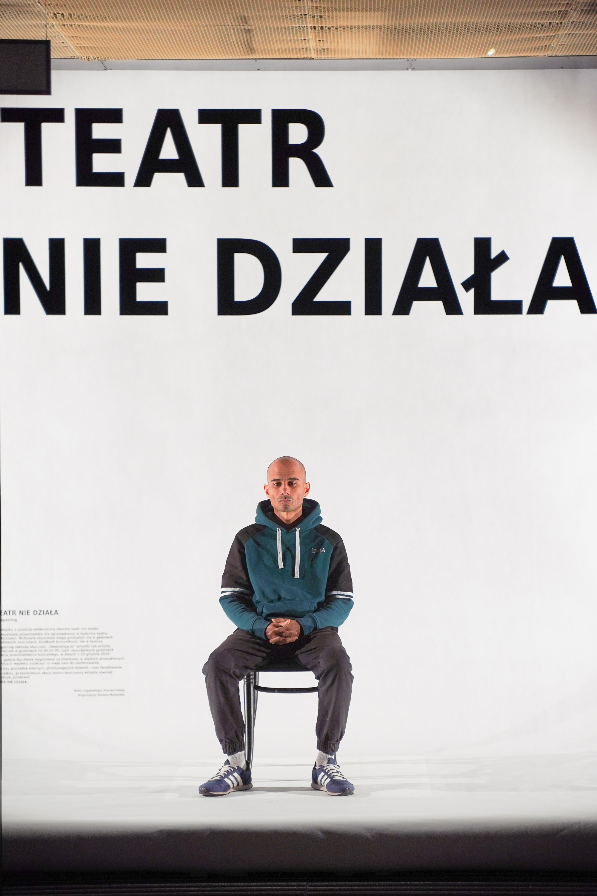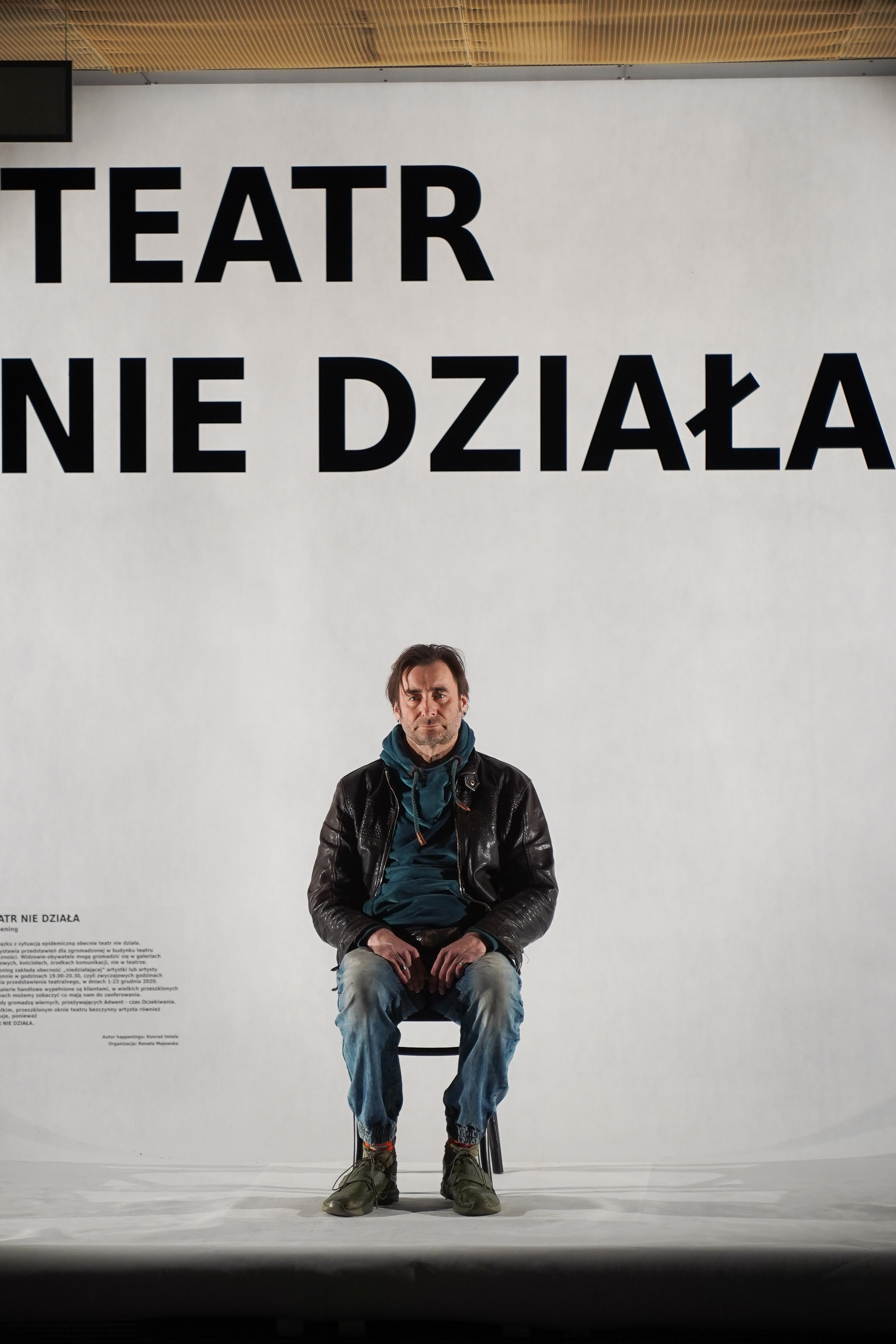 W wielkim, przeszklonym oknie teatru bezczynny artysta również oczekuje, ponieważ  TEATR NIE DZIAŁA.
