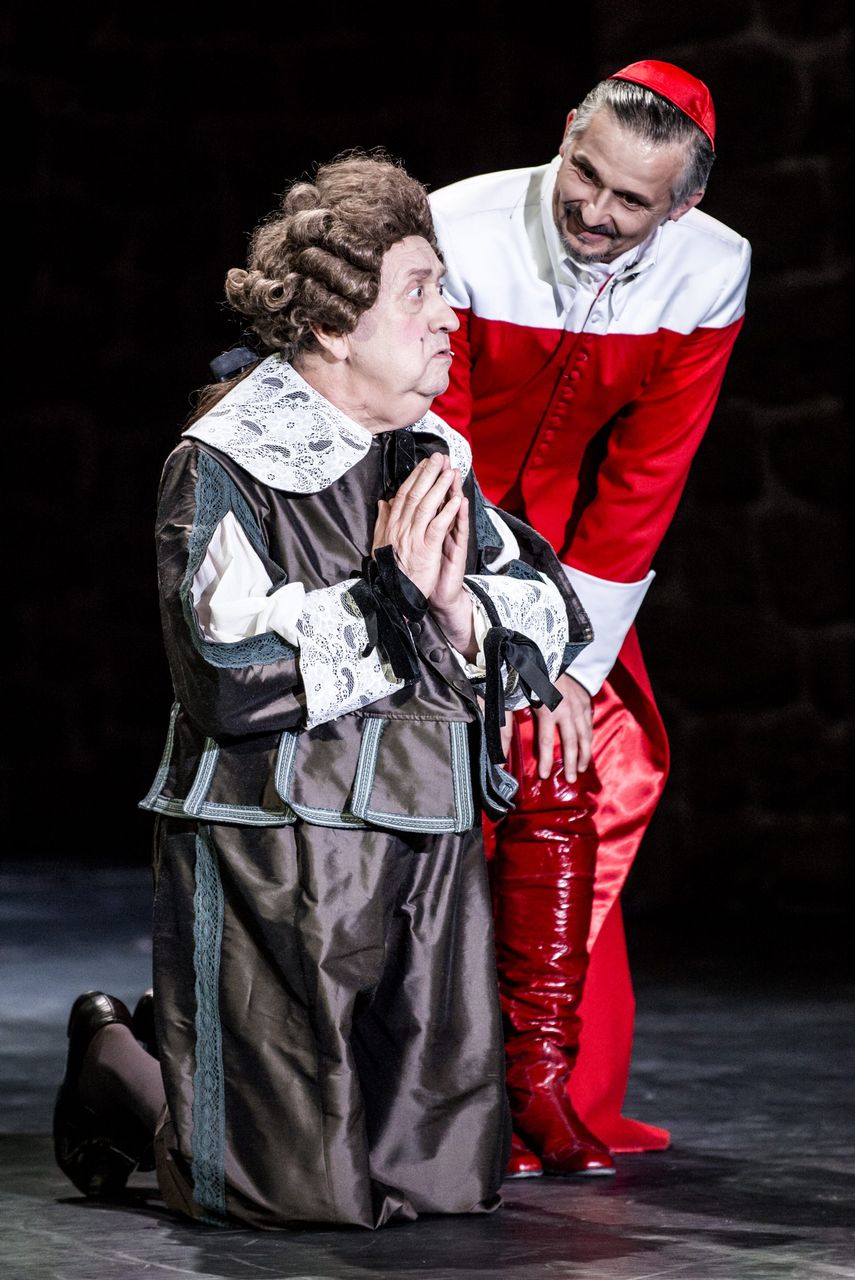 Na zdjęcie Andrzej Gałła jak Pan Bonacieux i Błażej Wójcik jako kardynał Richelieu – fot. Łukasz Giza