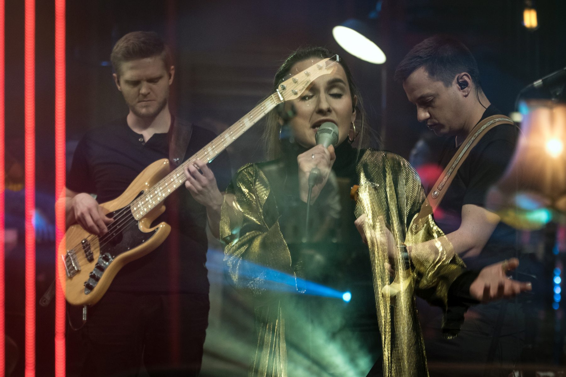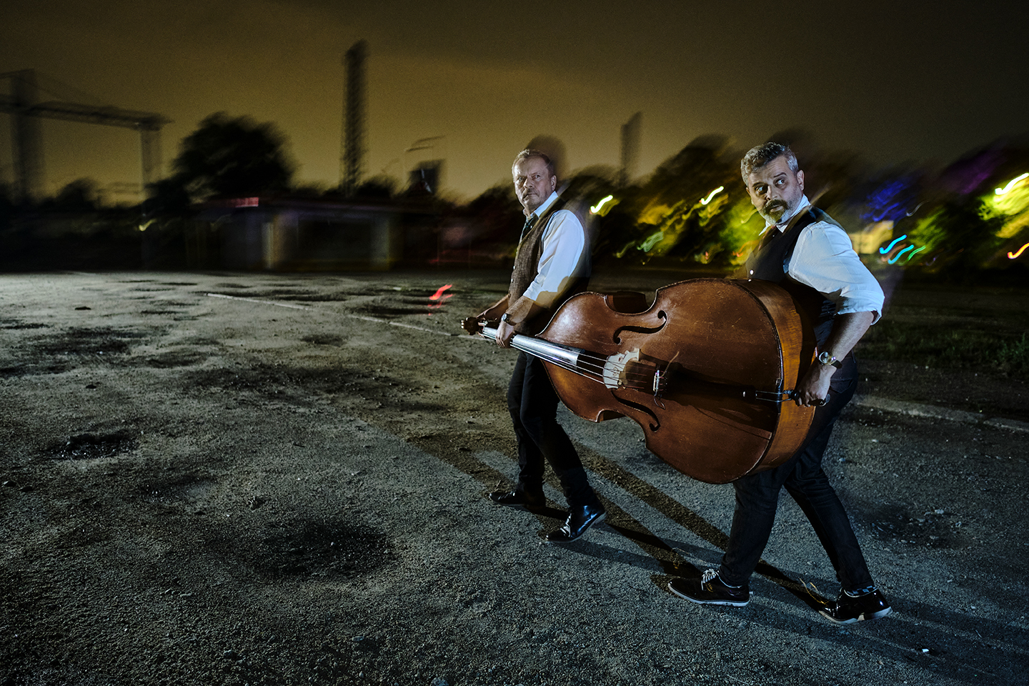 Adam Skrzypek z kontrabasem i Konrad Imiela z gitarą, śpiewający do mikrofonu na statywie.